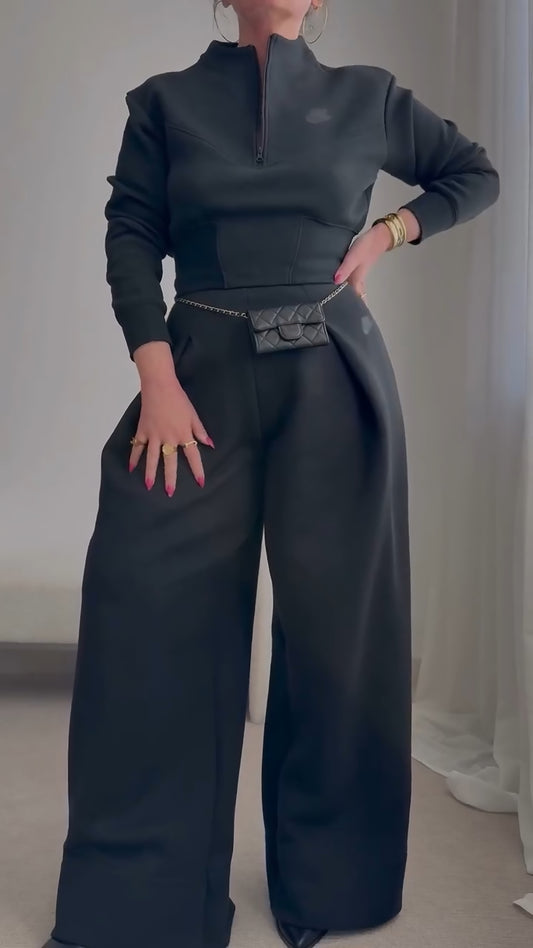 Pink Blouse and Black Suspender Wide-Leg Pants Set