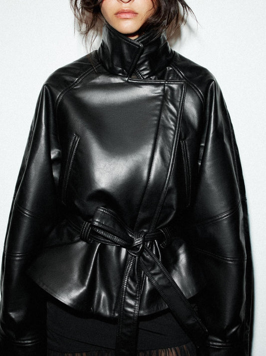 Leather Jacket Casual Belt Button Down Blazer Trendy Coat Outerwear