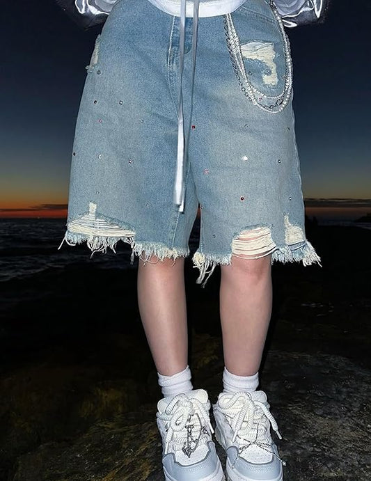Crystal Stud Bermuda Jorts – Oversized Street Denim