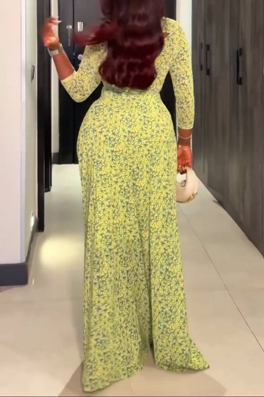 Floral Asymmetrical Shoulder Long Sleeve Waist-Cinched Maxi Dress