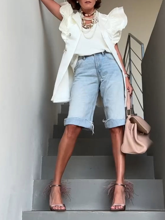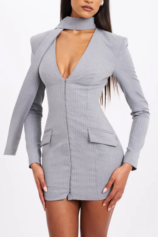 Deep V Pinstripes Gray Blazer Dress with scarf collar