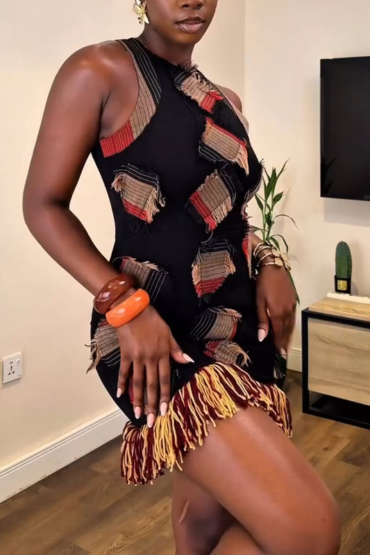 Black Spaghetti Strap Tassel Embroidered Asymmetrical Midi Dress