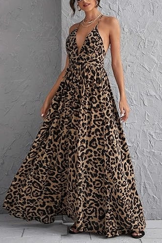 Deep V Neck Leopard Crisscross Backless Beach Maxi Dress