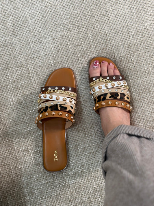 Studded Multi-Strap Slide Sandals – Leopard, Chain & Glam Accents