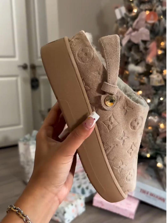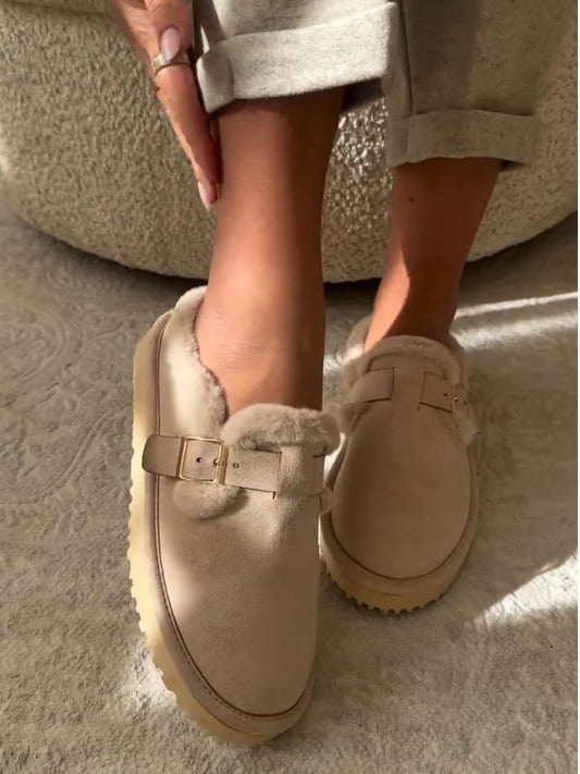 Faux Fur Lined Suede Clogs with Back Heel and Buckle Detail