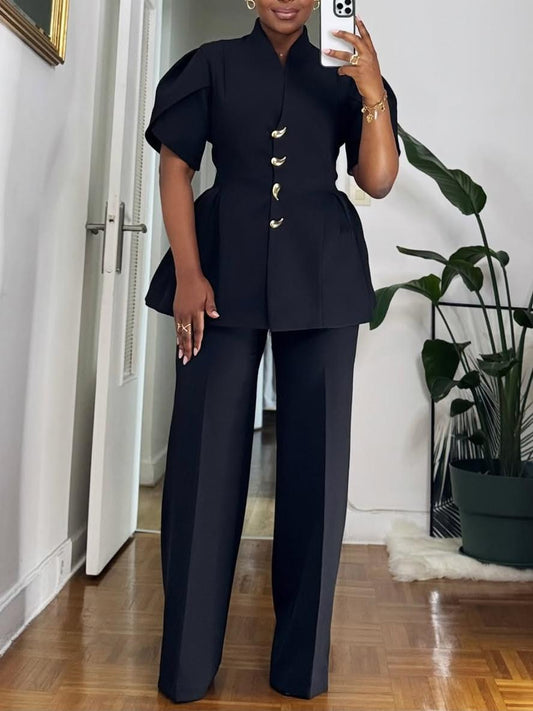 Elegant Black Two-Piece Pantsuit – Short-Sleeve Blazer & Wide-Leg Trousers