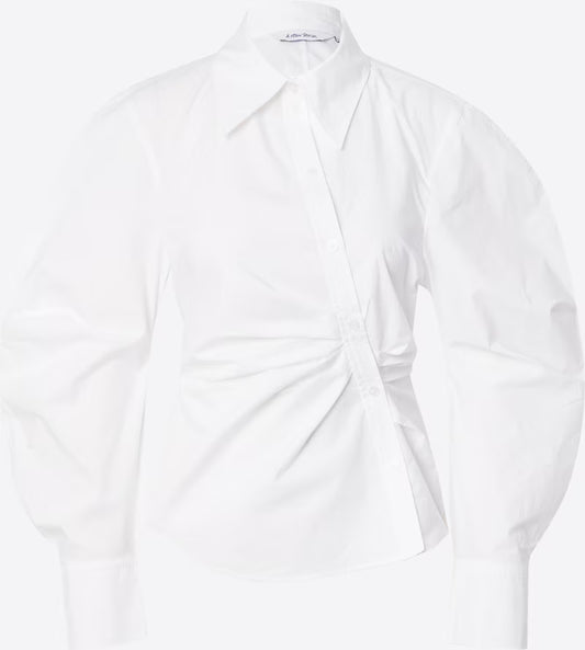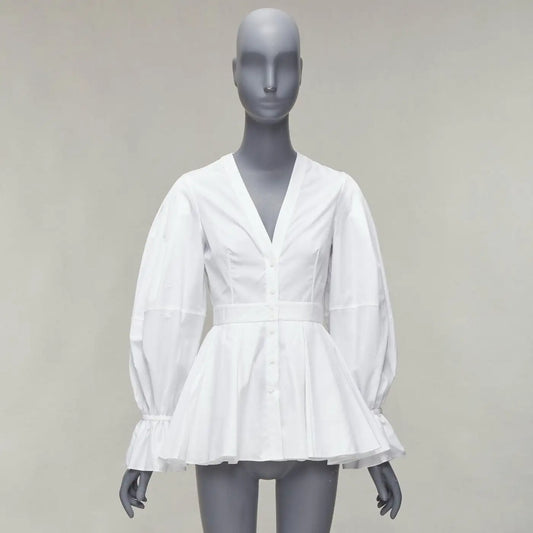 White Cotton V-neck Balloon Sleeve Peplum Dress Shirt